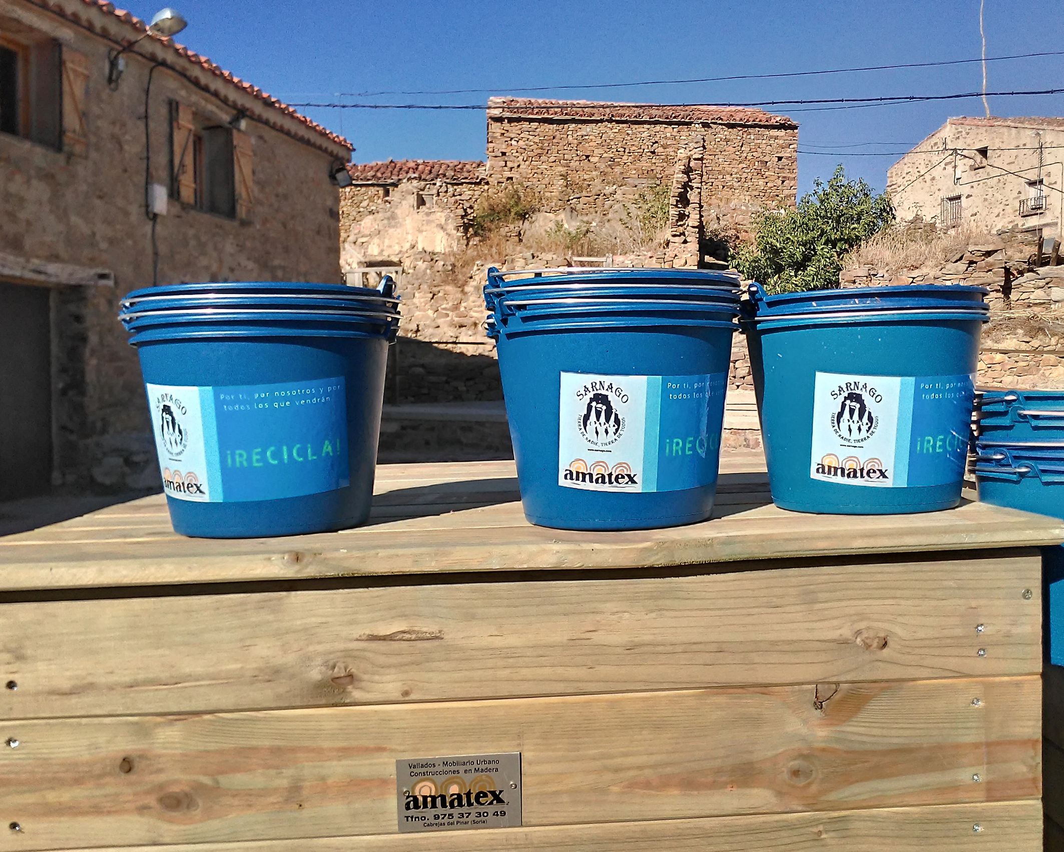 El colectivo trasladó a Amatex la intención de colocar dos recogedores de compost en pueblo con el objetivo de que los vecinos de Sarnago, sobre todo en época estival, pudieran desechar allí sus residuos y generar compost. Amatex recogió el guante sin dudarlo y fabricó, de manera gratuita, dos composteras con una capacidad de un metro cúbico cada una que el colectivo ha colocado en el barrio de arriba una, y en el barrio de abajo la otra.