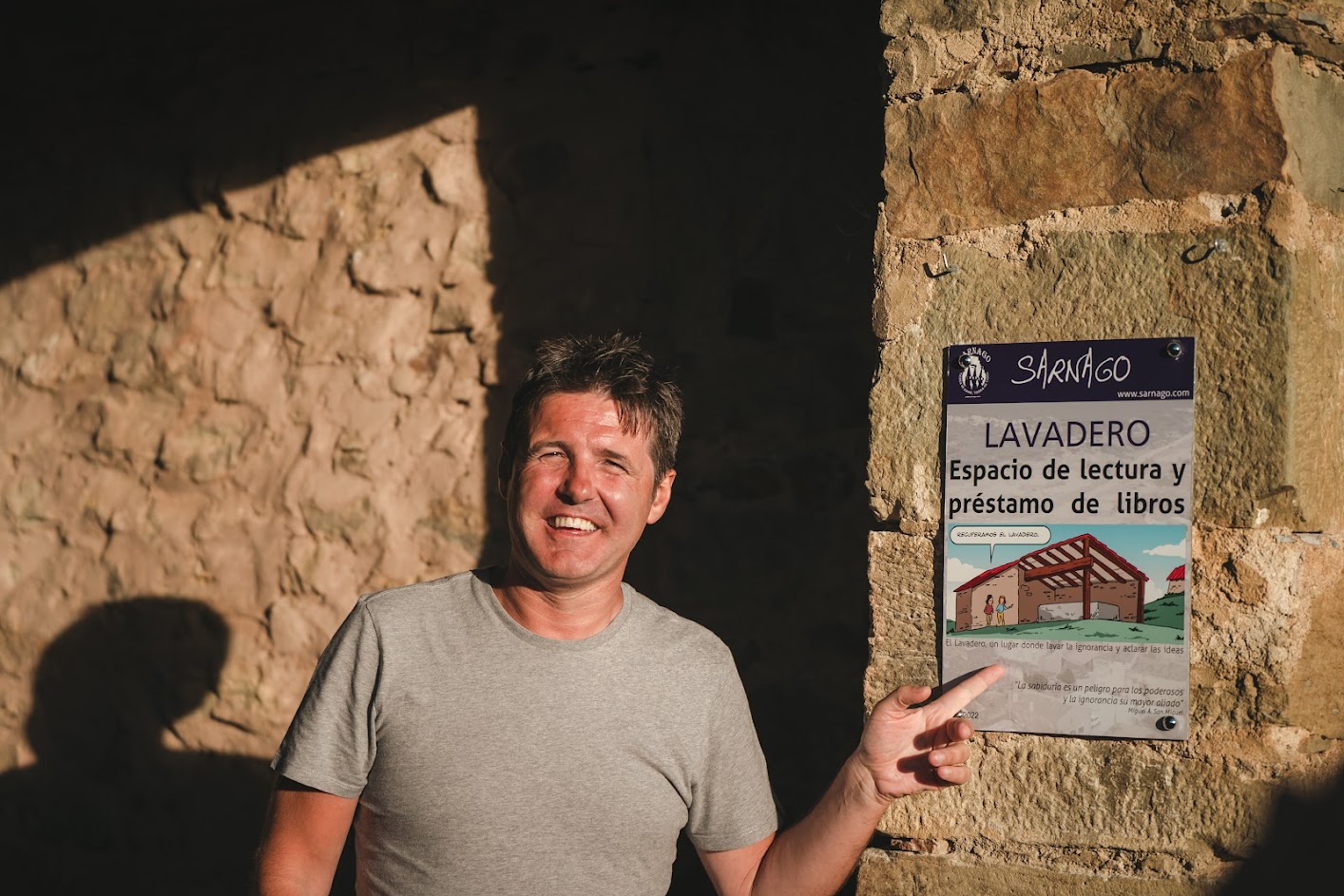 Desde que en los pueblos se dieron cuenta de que tenían pequeñas joyas aguardando que las miradas giraran hacia ellas, son muchos los que no se han limitado a que fueran restaurados, si no que han hecho de ellos aulas culturales. Recientemente visité el de Navalcaballo, con exposición de fotos antiguas, pero son muchos más: Añavieja, Fuentecantos… y, ¡cómo no! Sarnago, siempre en la vanguardia de las ideas, Sarnago, referente cultural de la provincia, albergue de mentes lúcidas, de esas capaces de no parar nunca pariendo ideas. Y con el eslogan de El lavadero, un lugar donde lavar la ignorancia y aclarar las ideas, han instalado, en las recias paredes de piedra, estanterías repletas de libros bien para llevarse directamente o para cogerlos prestados. En la placa, con dibujo que también aparece en el cómic, puede leerse una frase de Miguel Ángel San Miguel: “La sabiduría es un peligro para los poderosos y la ignorancia su mayor aliado”.