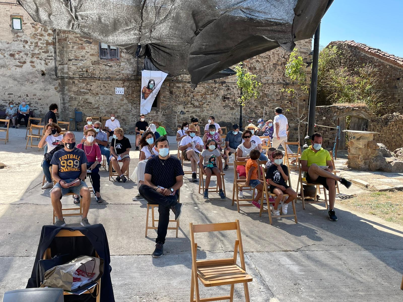 Una vez terminado este acto, pasamos a la parte más emotiva de la mañana. Se procedió a homenajear a Goyo Sanz. José Mari Carrascosa hizo un breve repaso de la trayectoria de Goyo como fundador de la plataforma Soria Ya y de su incansable lucha por esta bonita provincia. El motivo del homenaje era doble, por una parte esta lucha por Soria y como socio de mayor edad en la Asociación Amigos de Sarnago a la cual pertenece desde hace unos pocos años, pero que para nosotros ha supuesto un reconocimiento a nuestro trabajo en la recuperación del pueblo. Goyo, muy emocionado, agradeció este reconocimiento que dijo no merecía pero que se sentía muy orgulloso de recibirlo en un pueblo tan luchador como Sarnago.
